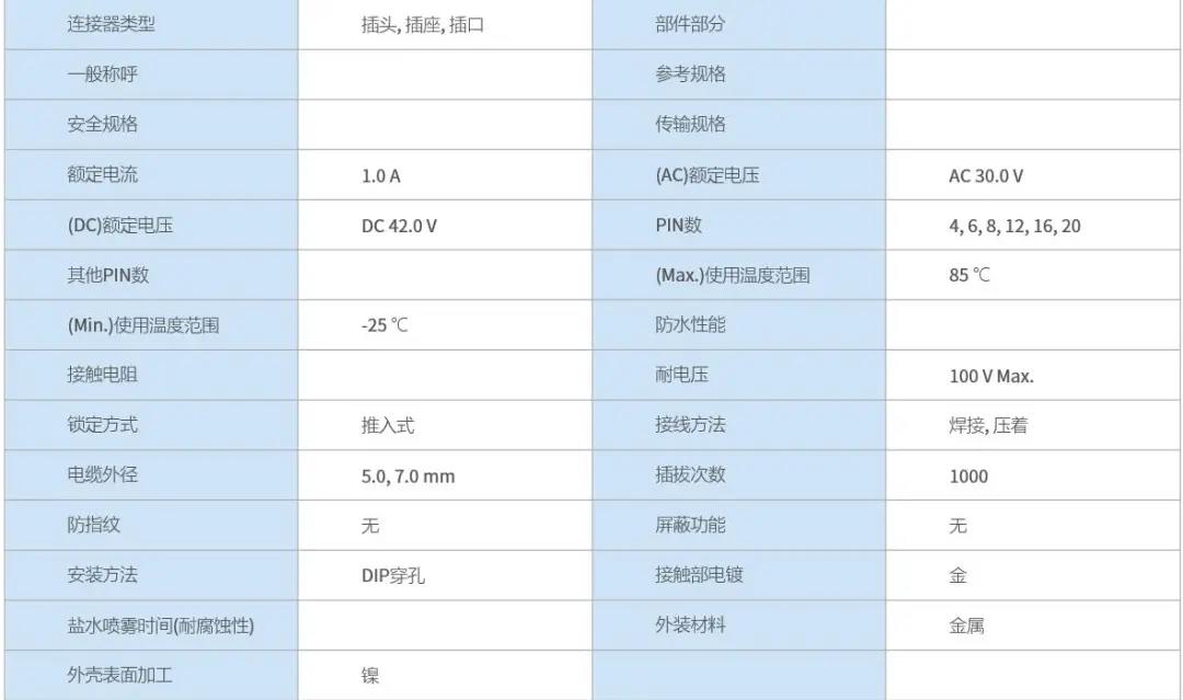 特点 1 超小级高密度圆形连接器 2 具有良好操作性的推拉锁 3 EMI对策设计 4 支持Cat.5e(1Gbps)高速以太网※ 5 丰富的选型 ※传输性能可根据线缆・引脚尺寸・结线方法而改变, 线束后确认实力。