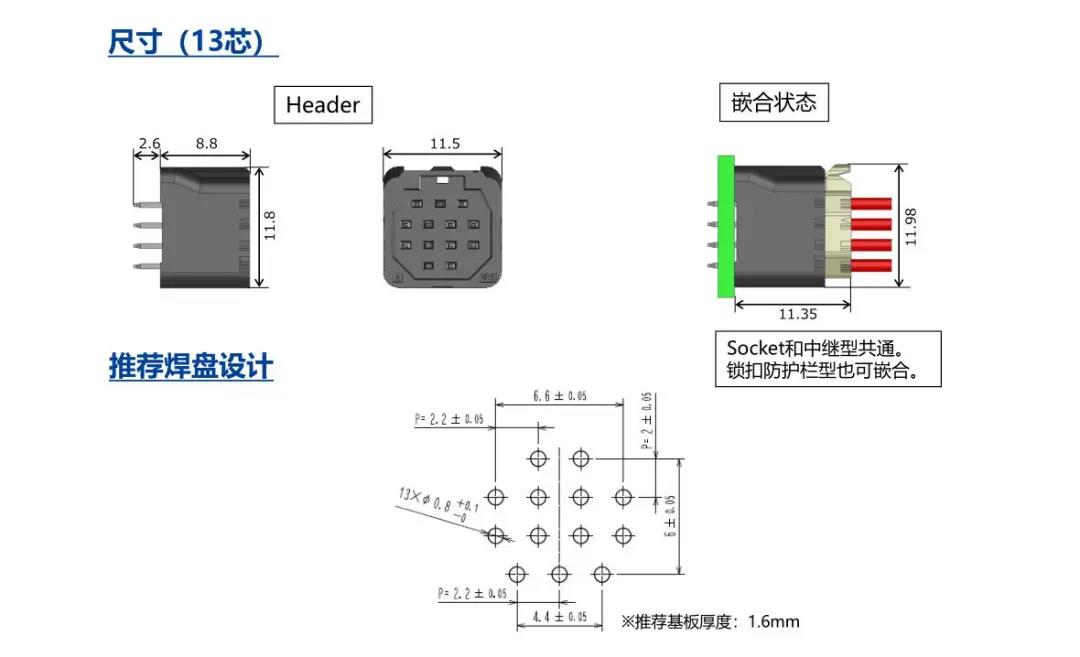 特点 [SignalBee™] 2 x 2.2 mm间距 用于狭小空间纤细型中继连接器(UL C-UL认证产品) 1. 纤细光滑的外形适合狭窄空间的布线 2. 清晰的锁扣感和目视可确认是否锁定 3. 可靠的接触结构 4. 坚固的端子结构 5. 芯数选型:2、3、4、5、6、7、13、24 DF62B:标准型 DF62C:锁加部保护强化型 DF62P:面板安装型 6. 可与DF11/DF59系列共用自动压着设备 7. 防冷凝措施(防水型DF62W) 细小